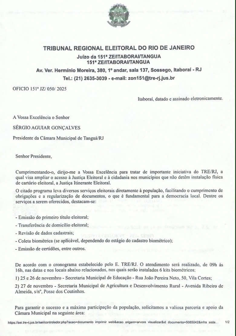 Através de ofício, a juíza eleitoral que representa a 151ª zona eleitoral pertencente aos municípios de Itaboraí e Tanguá, Viviane Ramos de Faria, fez um comunicado a Câmara Municipal de Tanguá nesta semana, que trata de uma ação que visa ampliar acesso aos munícipes, em cidades que não possuem sede física do Cartório Eleitoral.